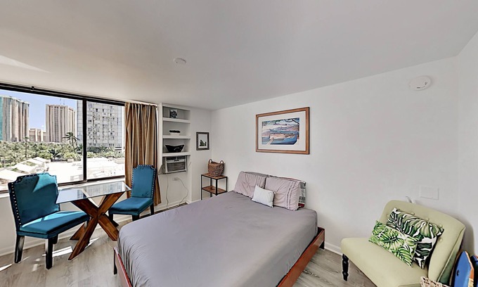 This chic studio has been thoughtfully designed for your comfort, featuring air conditioning, a smart TV, complimentary Wi-Fi, and cable. Enjoy the vibrant atmosphere of Honolulu as you unwind in this modern space. With easy access to shopping, dining, nightlife, and various activities, convenience is at your doorstep.