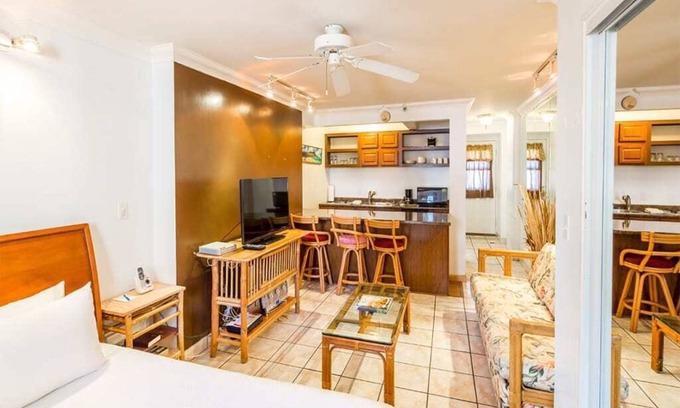 This inviting space accommodates up to three guests comfortably, offering a restful queen-size bed and a convenient sofa bed. Step out onto the direct access to the sun-drenched sundeck where you can sip refreshing mai tais while taking in breathtaking views of the ocean and iconic Diamond Head.