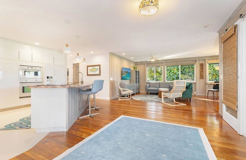Inside, natural light pours across open living areas with wood flooring and coastal-inspired accents. Gather in the lounge with Smart TV and plenty of seating, or share meals around the dining table after a day on the waves. Though the living room is not equipped with air conditioning, a cool tropical breeze flows nicely through the living and dining areas bringing a refreshing, crisp comfort to the air.