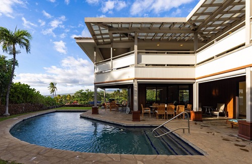 Welcome to Hale Wailani, a stunning home that embodies the spirit of Hawaiian living, tailored perfectly for families seeking adventure and relaxation. This exquisite property boasts an impressive 3,700 square feet spread over two levels, along with an additional 2,000 square feet of sheltered lanai space, ensuring you have ample room to unwind and enjoy breathtaking vistas of Mauna Kea, Mauna Loa, the Kohala Mountains, and Waialea Bay from nearly every corner of the house.